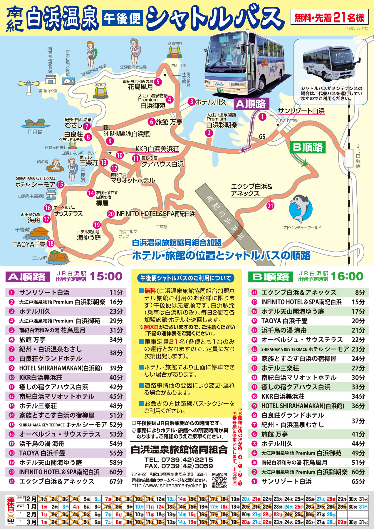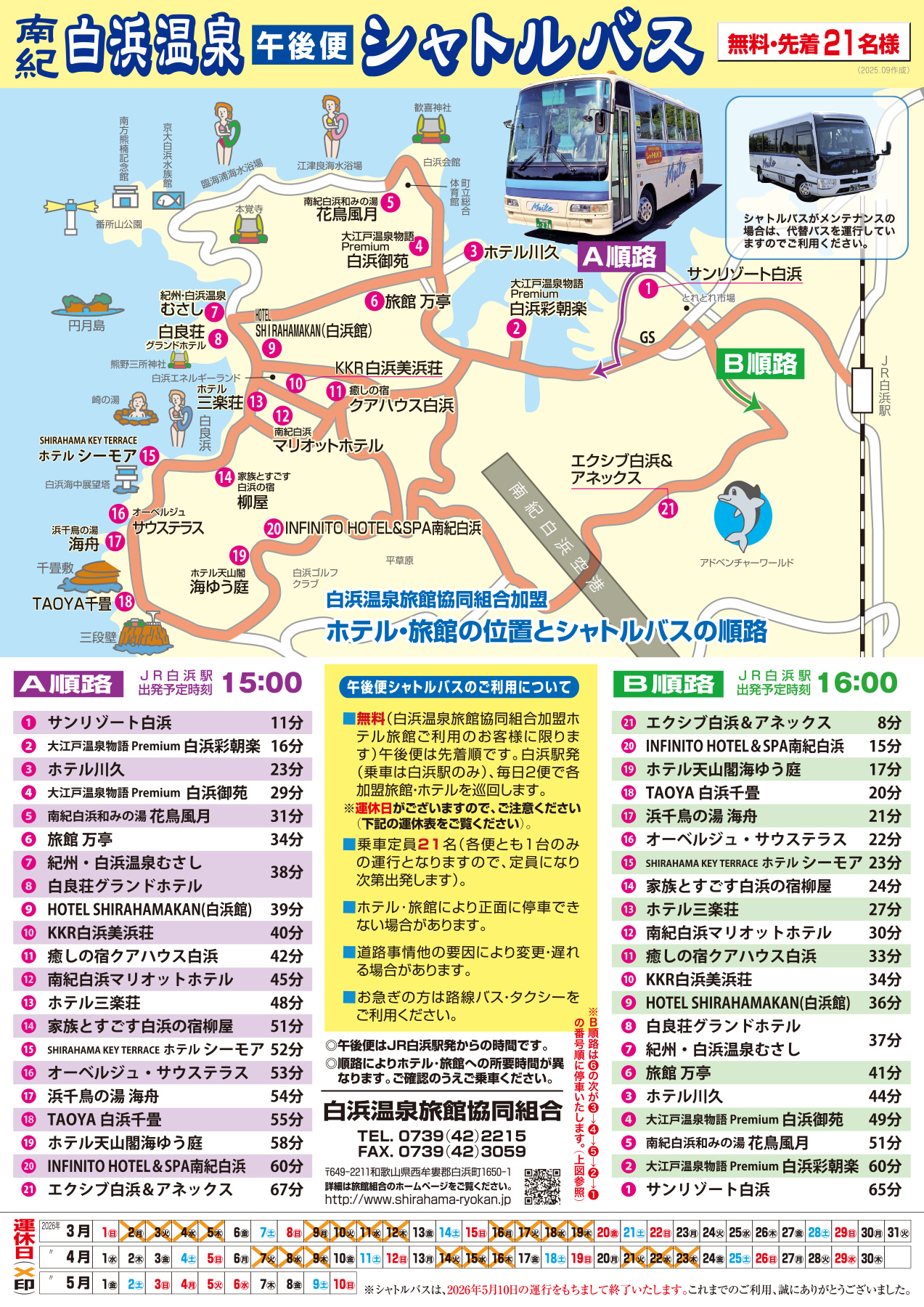 - 午後便は先着順です。白浜駅発(乗車は白浜駅のみ)、一日2便で各加盟旅館・ホテルを巡回します。